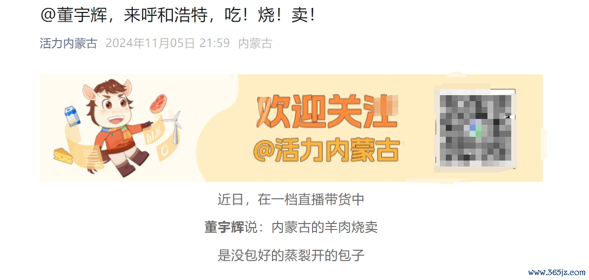 11月5日晚,内蒙古自治区互联网信息办公室旗下公众号“活力内蒙古”以《@董宇辉,来呼和浩特,吃!烧!卖!》为题发文,向广大网友介绍并推荐此次舆情风波中心的地方特色美食:内蒙古烧卖。